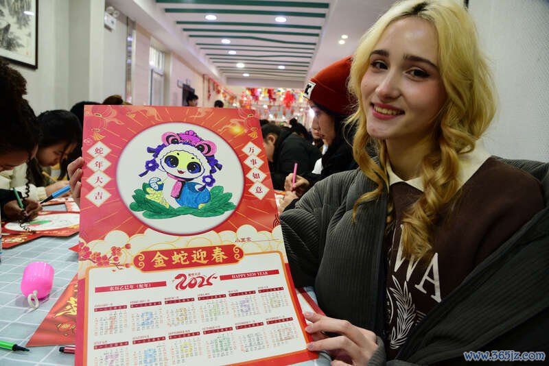2025年1月21日,江苏大学的异邦留学生形色蛇年主题年历,品味中国文化。视觉中国供图
