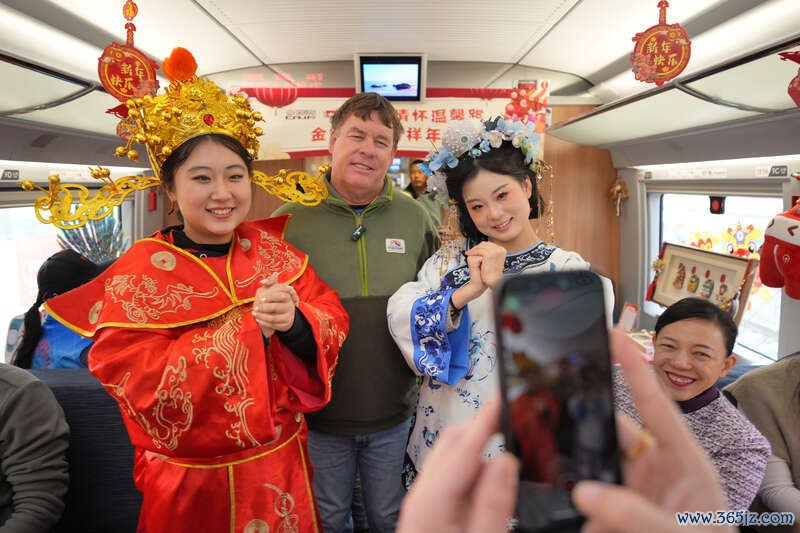 2025年1月18日,山东烟台的G1088次列车上,别称异邦搭客与“财神爷”和“夏雨荷”合影,多彩文化行动和气春运路径。视觉中国供图