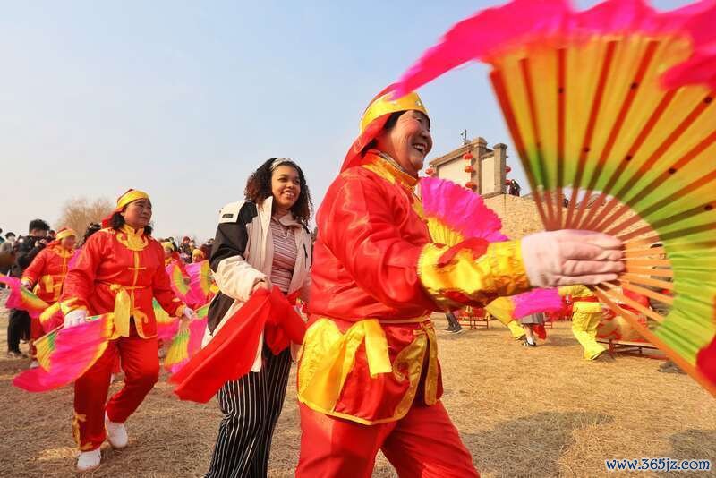 2025年1月21日,山东泰安岱岳区“古韵新声平稳迎春”行动吵杂举行。泰山学院的异邦留学生参与扭秧歌,体验中国春节传统习尚。视觉中国供图