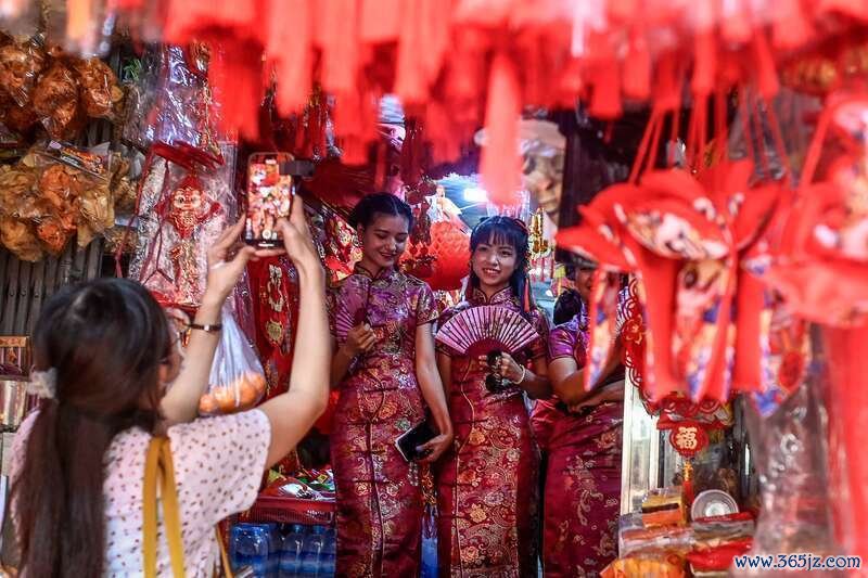 当地时间2025年1月22日,缅甸仰光的年青东谈主在当地年货阛阓试穿旗袍,置办春节新衣和荫庇品。视觉中国供图