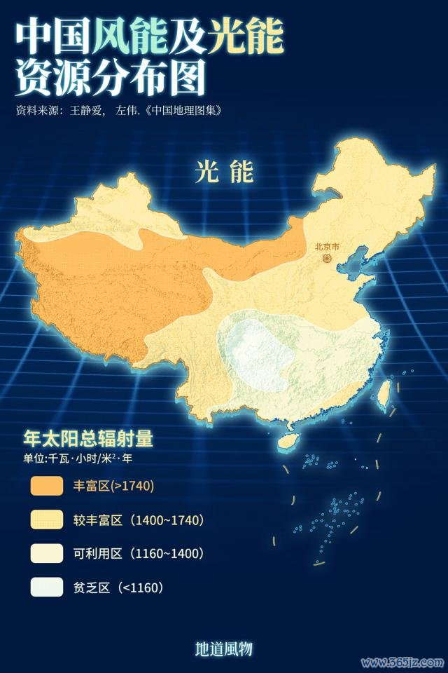 这些区域海拔较高,地形相对平坦,从而造成了我国"三北"(东北、华北、西北)地区首要的连片风能带。而在甘肃、内蒙古、青海、西藏、新疆等地,全年太阳总发射量绝顶丰富,又成为了我国的"光能中枢"。