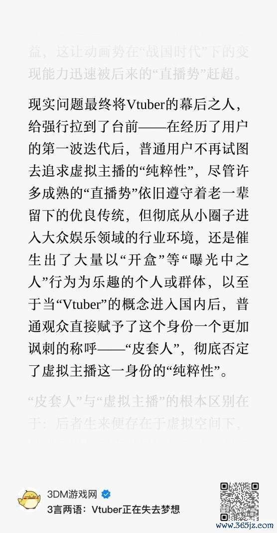 本年 3 月份,因为绊爱在时隔三年后回生,裁剪部的伊东敦朴写了篇"一言半字",名为《 VTuber 正在失去守望》。我并不是个至极懂得 V 圈种种事的东谈主,对 VTuber 的默契也仅限于基本比拟熟的面目,但我却很能持续伊东敦朴在著作中所说的"失去守望"是什么意味。因为,咱们刻下所看到的好多源自 V 圈的狠活,所传递出的印象,确乎与伊东敦朴在著作中所描摹的那种"隧谈性",有着不小的差距。