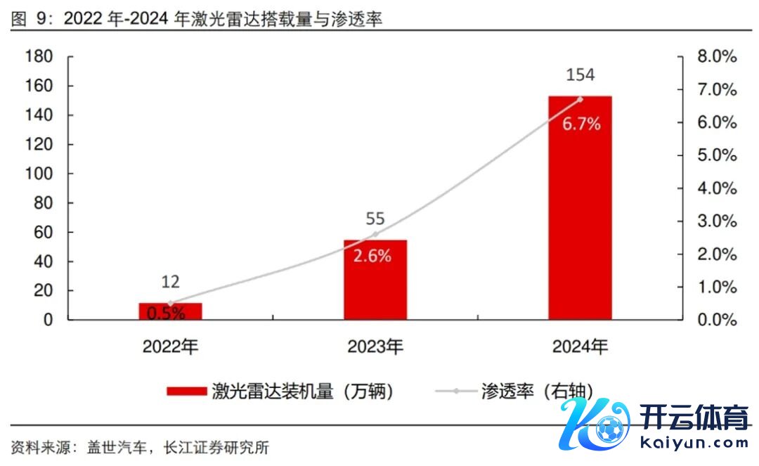 目下NOA迟缓下探至10万元以下的车型,2022年到2024年,激光雷达的装载量从12万辆马上增长至154万辆,渗入率从0.5%升迁至6.7%。